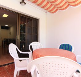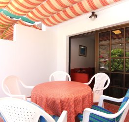 Terrasse med spisebord, uttrekkbar markise, noen trinn til bassenget