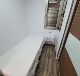 - Lite soverom med enkeltseng og garderobeskap og med vindu med direkte lys fra gaten.