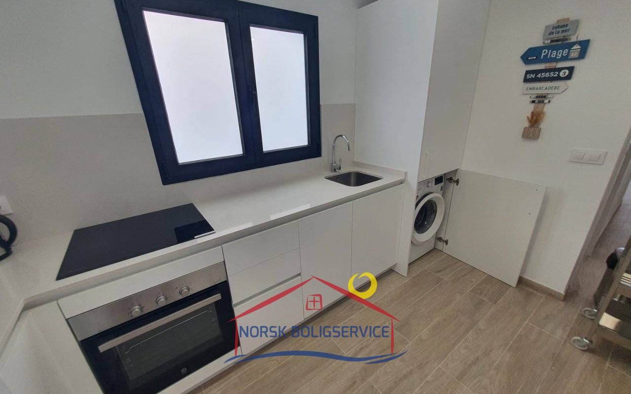 Fullt utstyrt moderne kjøkken. Møblene og dekorasjonen skaper en frisk atmosfære, med mye lys. Vaskemaskinen er også plassert her.