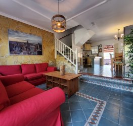 Stuen er et vakkert rom med blå flislagte gulv og steinlagte vegger i oransje stein. Rommet har en sofa grupper på to sofaer med et salongbord og en TV-benk med en TV. Stuen har store vinduer og en skyvedør i glass for mye naturliglys og som går ut til en terrasse.