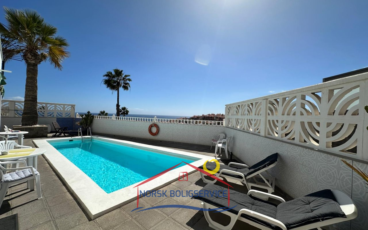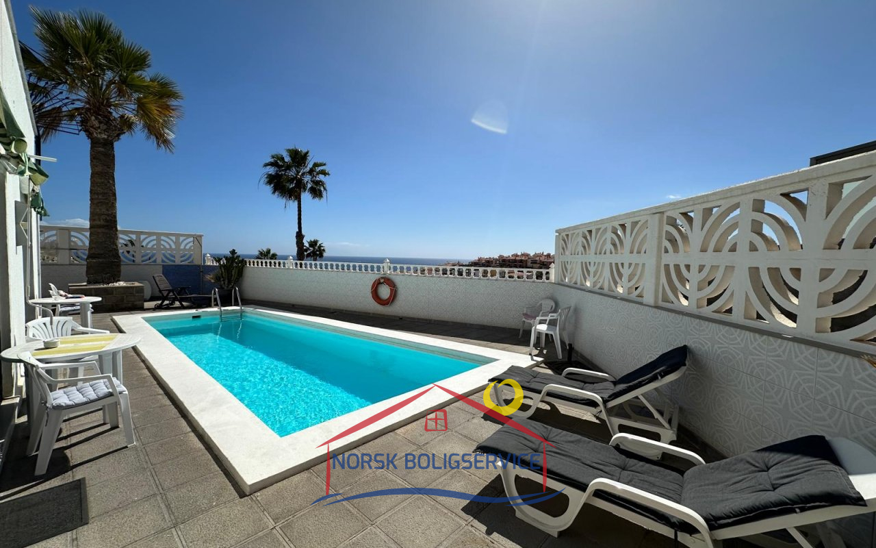 - Terrasse med basseng og havutsikt der man kan nyte solskinnsdager med familie og venner.