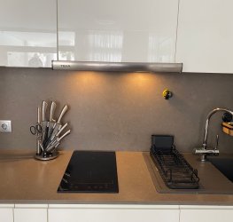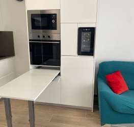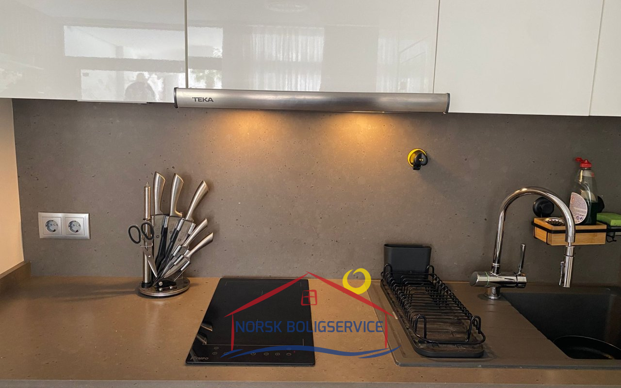 Moderne stue med åpen kjøkkenløsning, svært lys takket være naturlig lys fra direkte tilgang til terrassen. Kjøkkenet er fullt utstyrt, og stuen har en meget komfortabel sofa og TV.