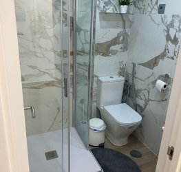 Komplett bad med dusj, moderne og funksjonelt.
