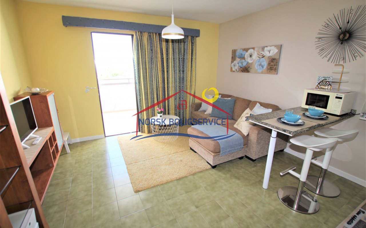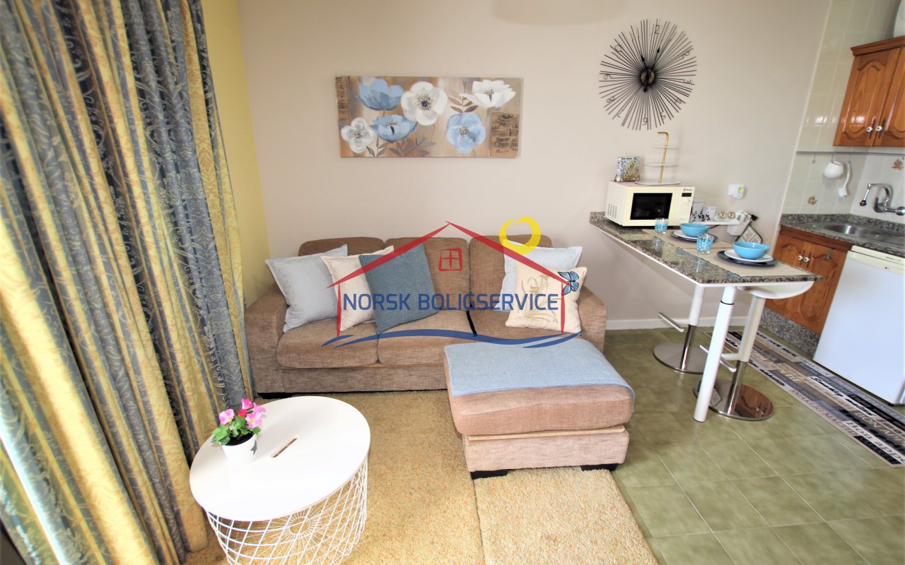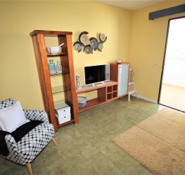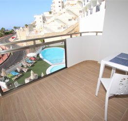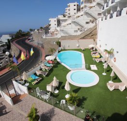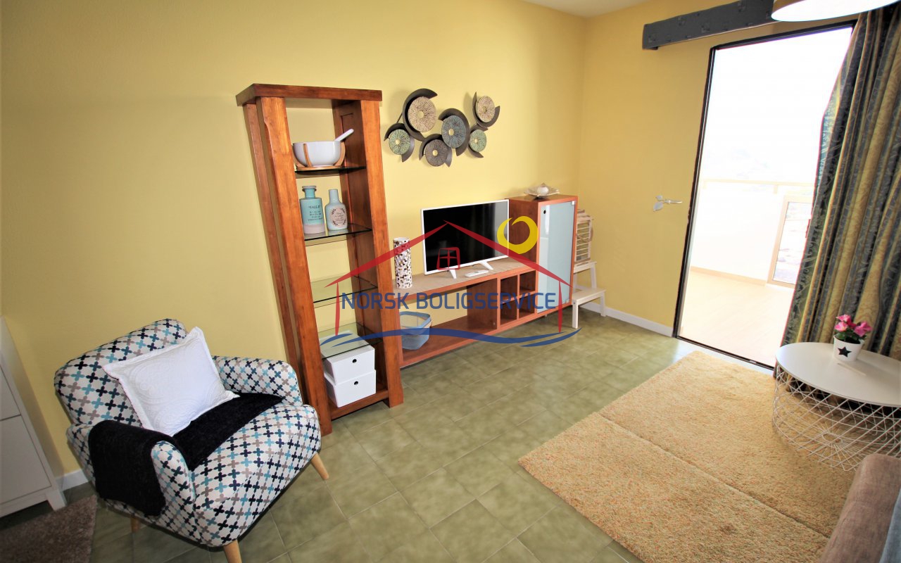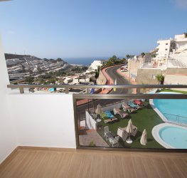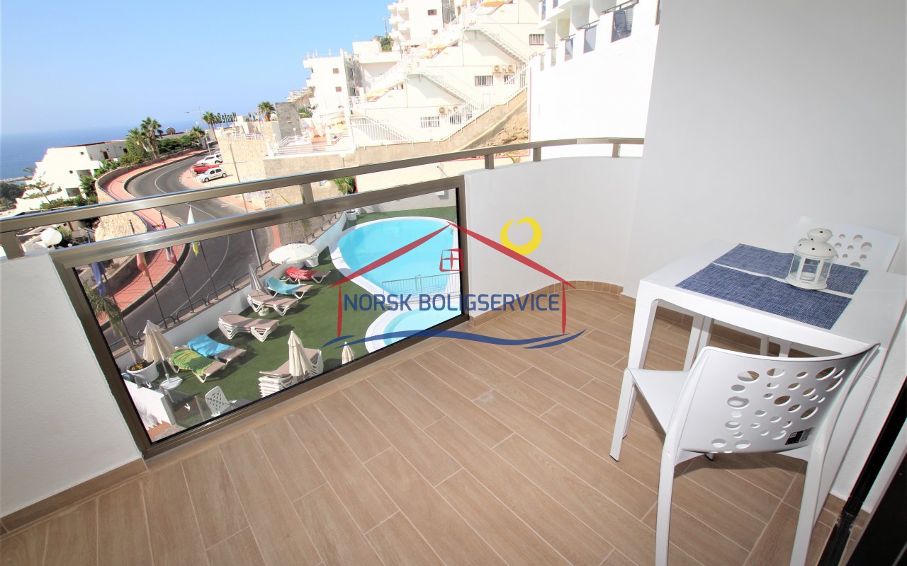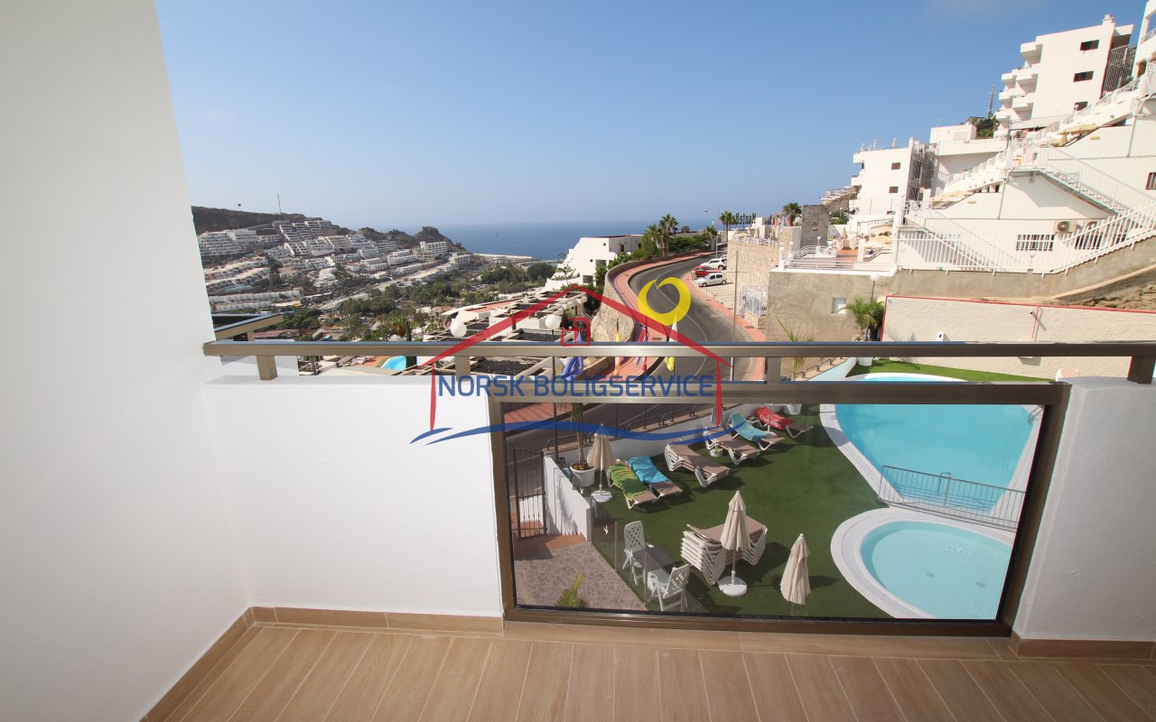Fin 1-soveroms leilighet i Puerto Rico. Bra terrasse med flott utsikt. Halvt år leie er 850 Euro per mnd.