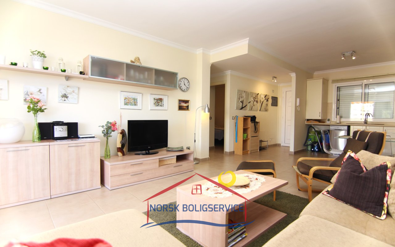A new modern apartment beautifully decorated in a modern style. The front door opens into the spacious living area and open-plan kitchen. The ample living space has a large L-shaped sofa, ideal for relaxing. There is a coffee table and a T.V.unit and storage with television. An armchair with foot rest is a lovely extra. From the living area there are large French doors with access to the sunny terrace that also has a table and chairs, the perfect spot to enjoy the sun and the warm evenings.