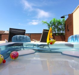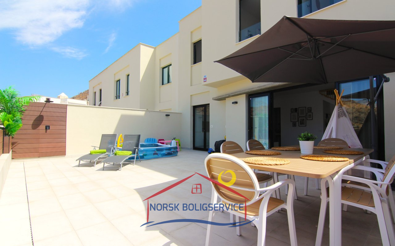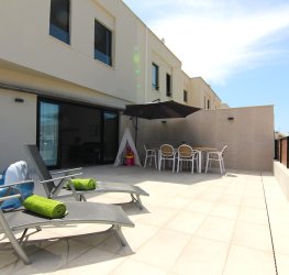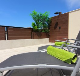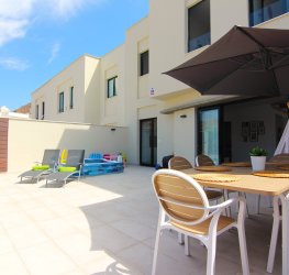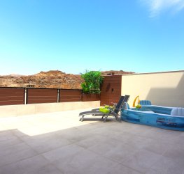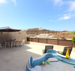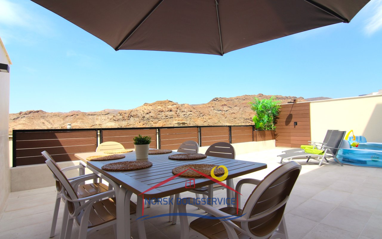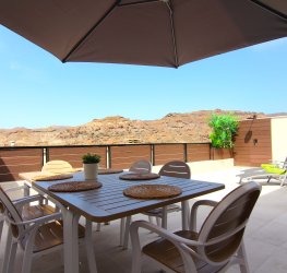- Gran terraza delantera con vistas al valle de Puerto Rico. Es una zona ideal para disfrutar del buen clima de la zona. Cuenta con hamacas, mesas, sillas y sombrilla para comer fuera cuando quieran y dispone también de ducha para refrescarse en los días más calurosos.