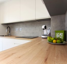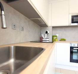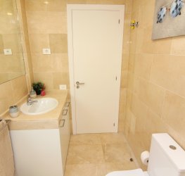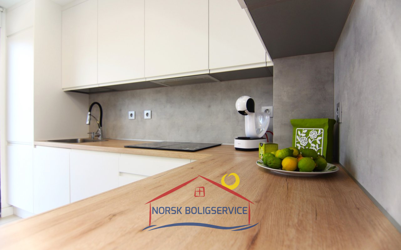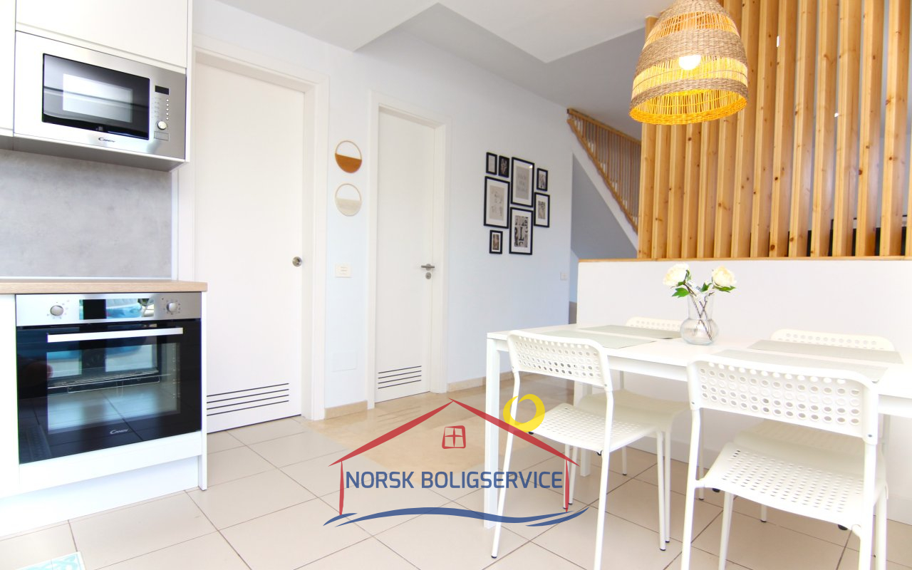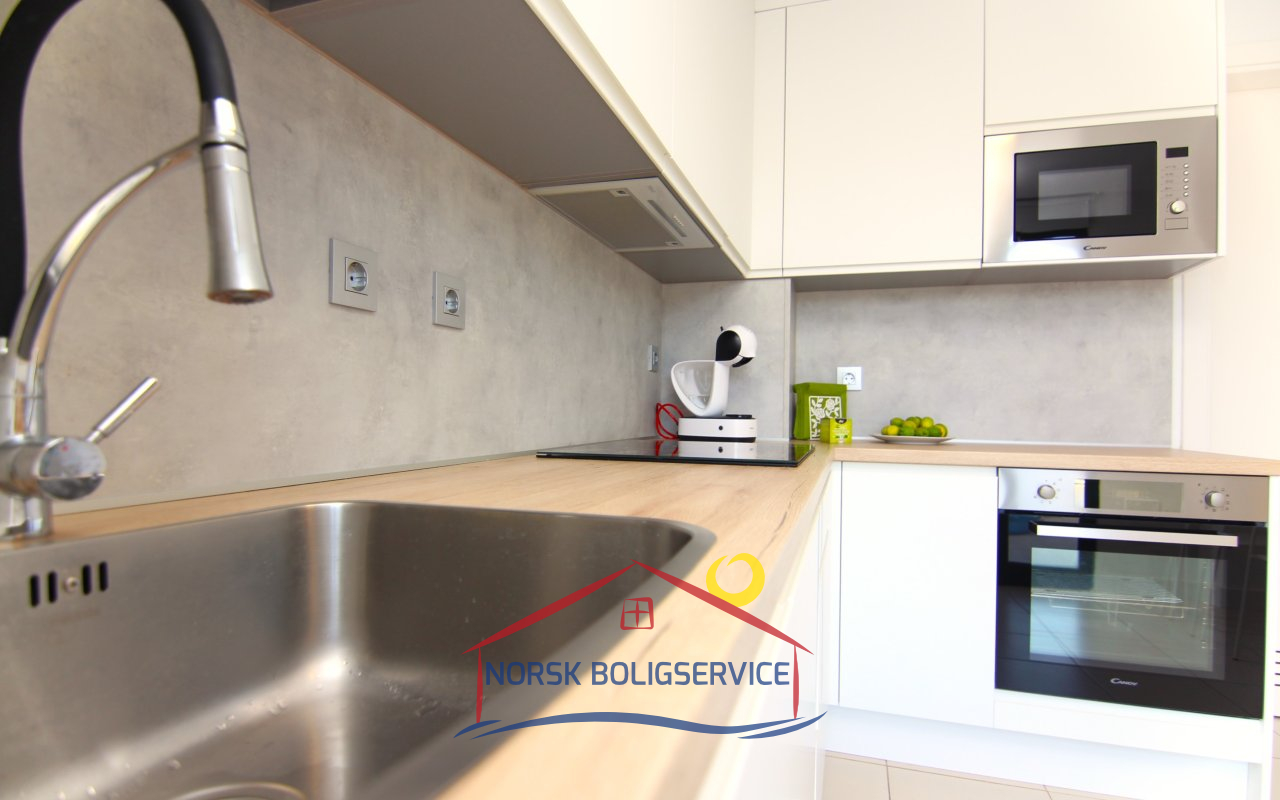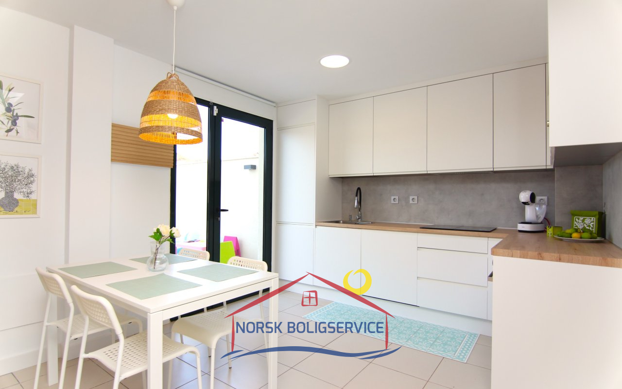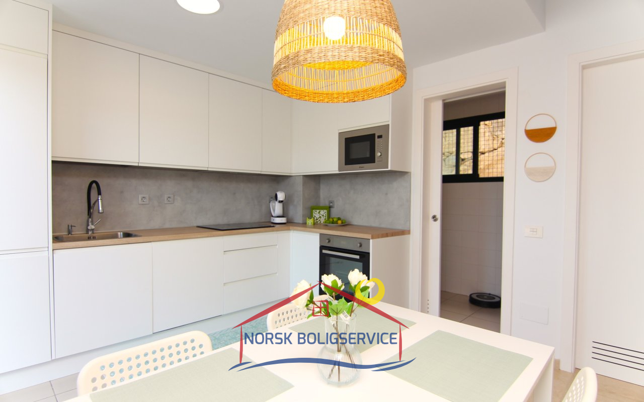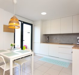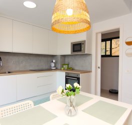 - Preciosa cocina totalmente equipada. Cuenta con horno, nevera, lavavajillas, vitro y microondas. Además, tiene una puerta de cristal que le da acceso directo a la terraza delantera y permite que entre luz natural durante gran parte del día.